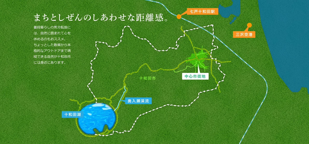 青森県南内陸部にある十和田市は、県内第4位の人口を擁する都市です。国の特別名勝及び天然記念物に指定された「十和田湖」、「奥入瀬渓流」など東北を代表する観光地としても知られています。古くは、「日本三大開拓地」のひとつとして、荒れ果てた台地から、川をつくり、田畑をつくり、全国でも有数な農畜産物の生産地域へと変貌を遂げました。現在は、十和田市現代美術館をはじめとした「アートの街」として、自然と調和する美しい街並みを築いています。