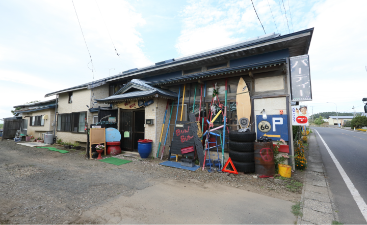 陸奥湾に沿って伸びる国道279号、別名『はまなすライン』。潮風を受けながらドライブしていると、ふいに原色の看板が目に飛び込んできます。サーフボードを欄間に貼り付けた看板に書かれた文字は『BUN BUN』。暖簾をくぐればそこには、和風の外観からは想像もつかない空間が広がります。