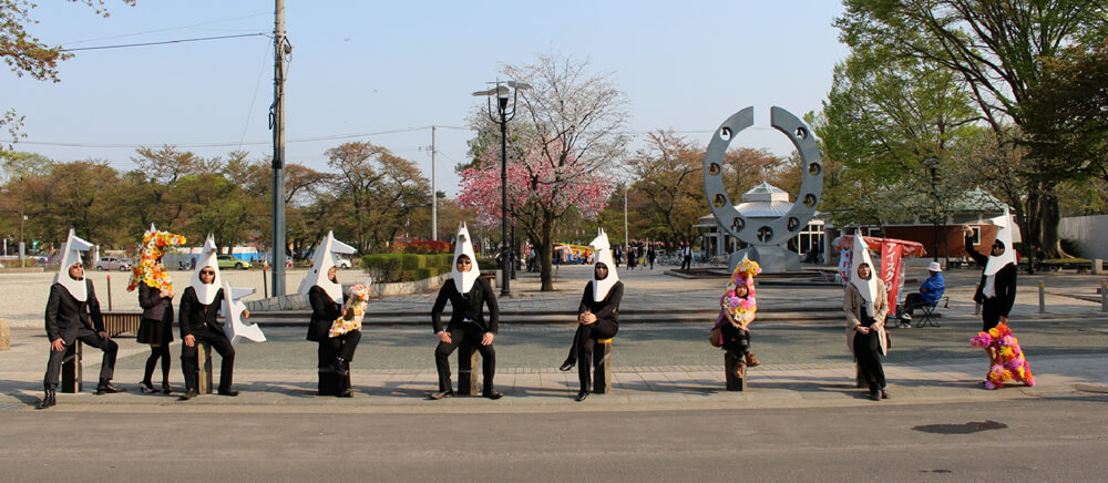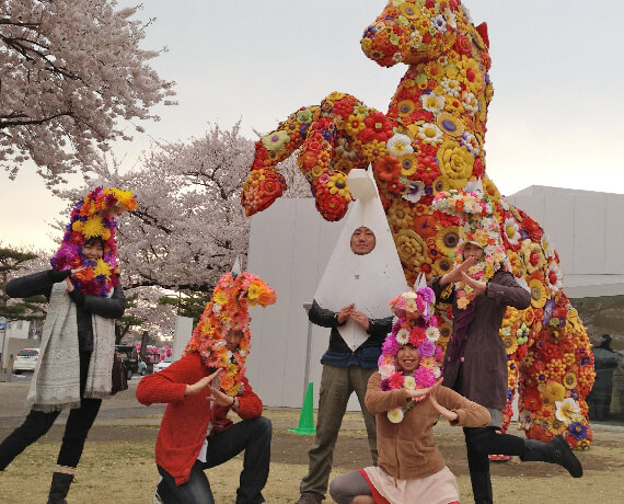 古くから馬産地として知られる十和田市の歴史と、新しい取り組みであるアートのまちづくりを融合させたウマジンは、人と人とをつなぐコミュニケーションツール。馬の頭をかたどったユーモラスなオブジェを被れば、誰でもウマジンに早変わりです。