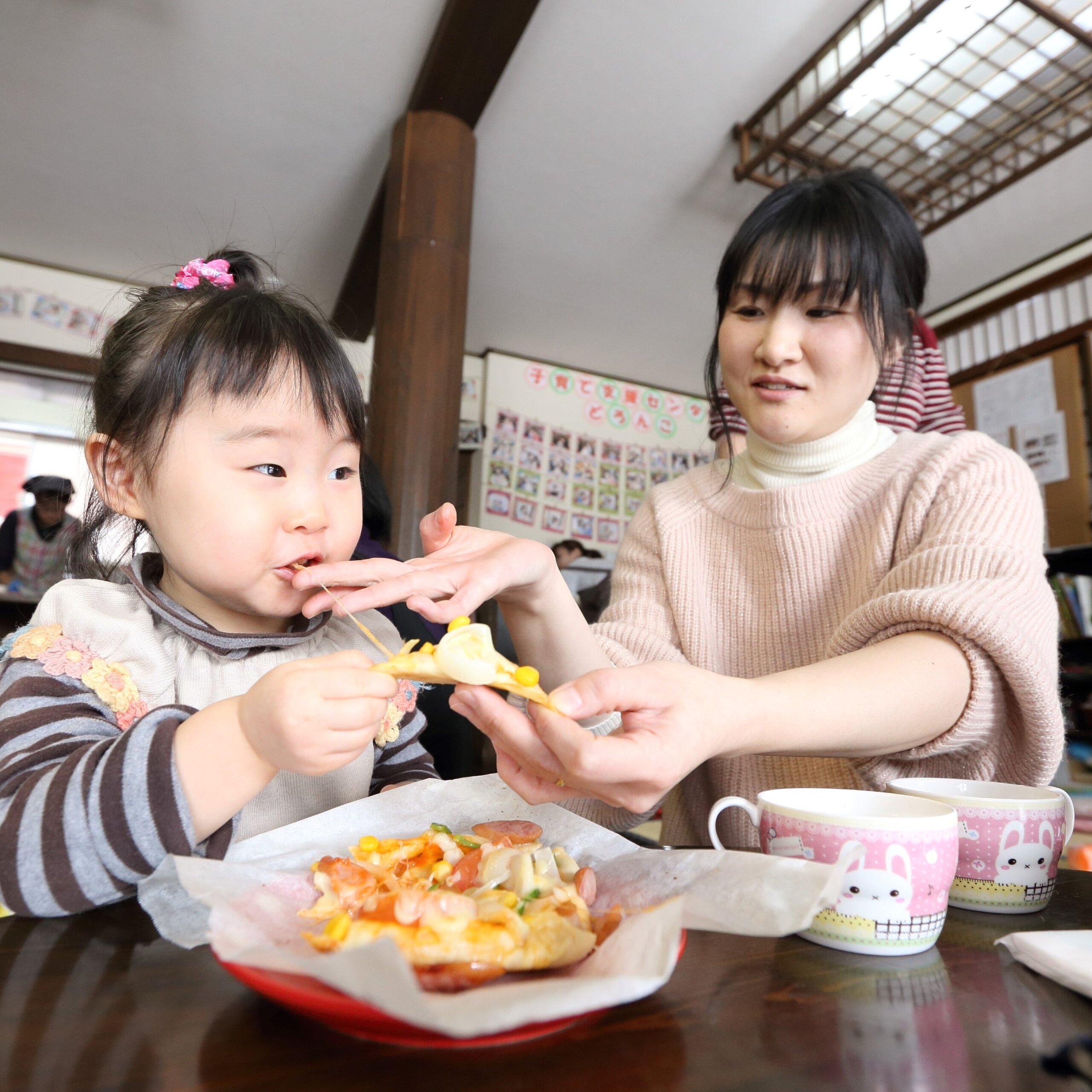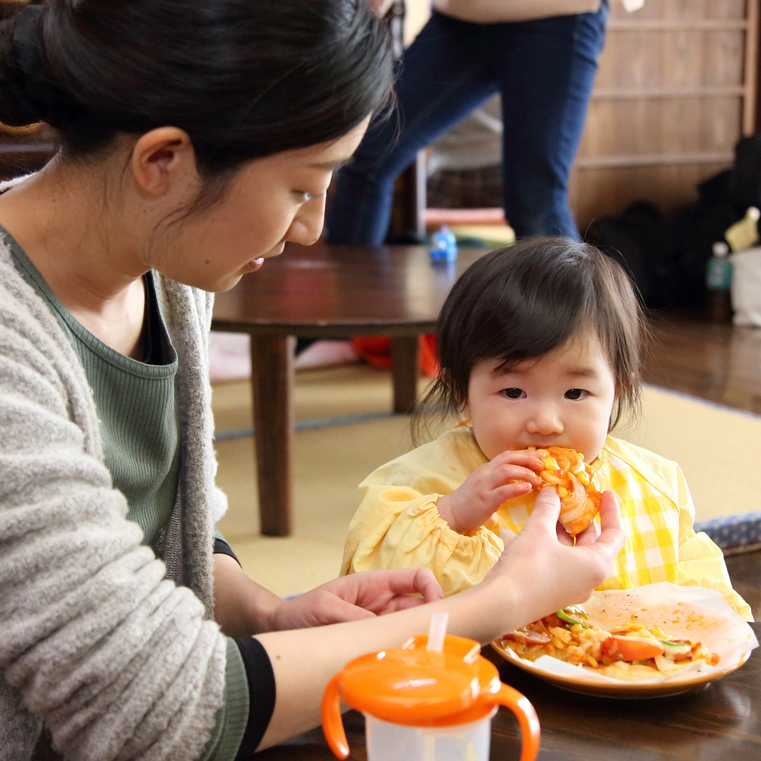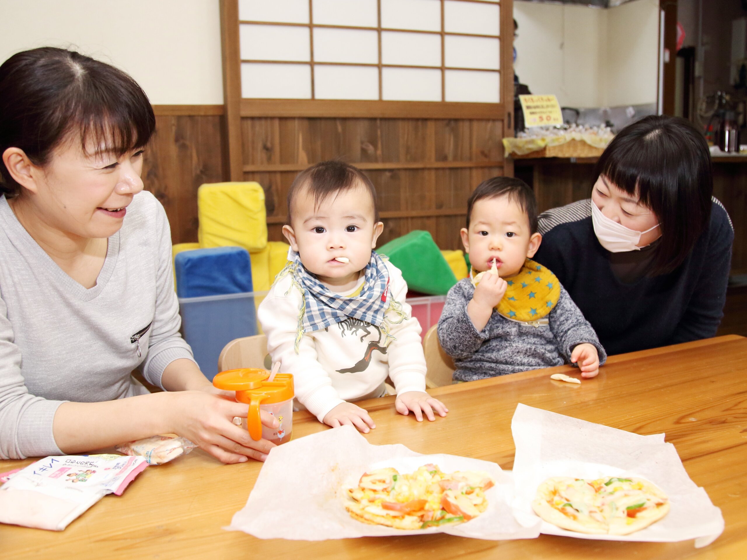 ボクも私もお手伝いして焼き上げたピザは、世界一の美味しさ⁉ ペロリと平らげた後は、ハイハイしたり手作りおもちゃを手に取ったりと、思い思いに楽しむ子どもたち。そんな様子を見守りながら、ママたちもお喋りに花を咲かせます。