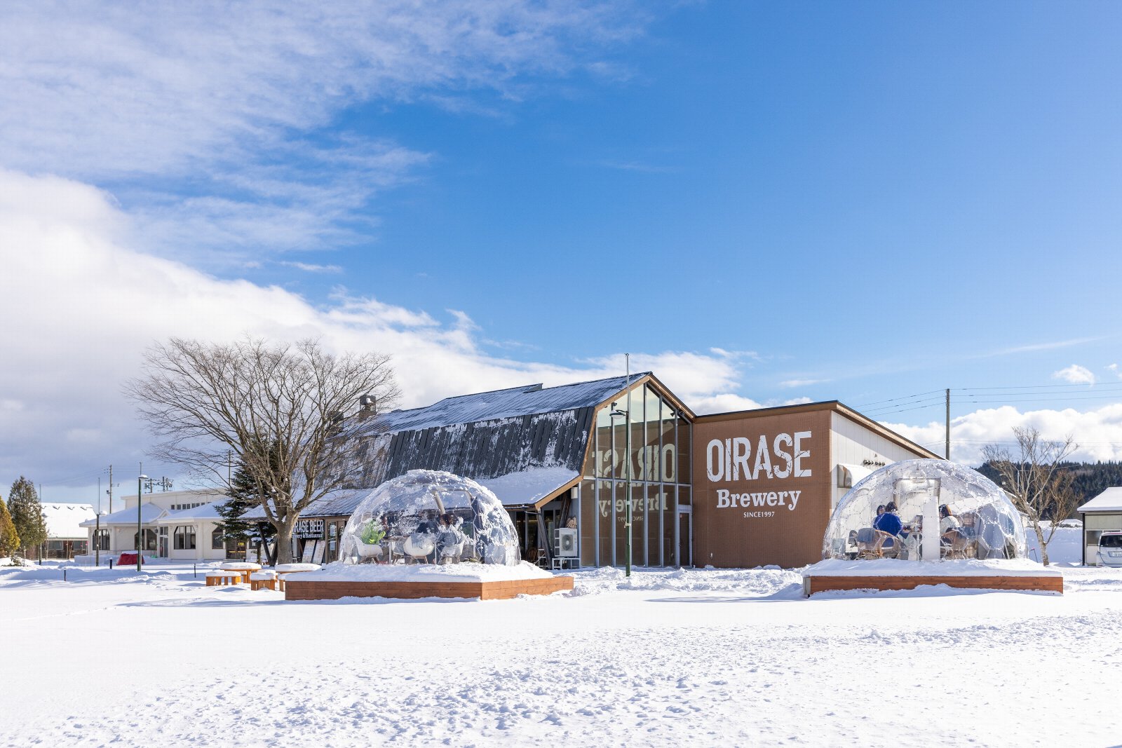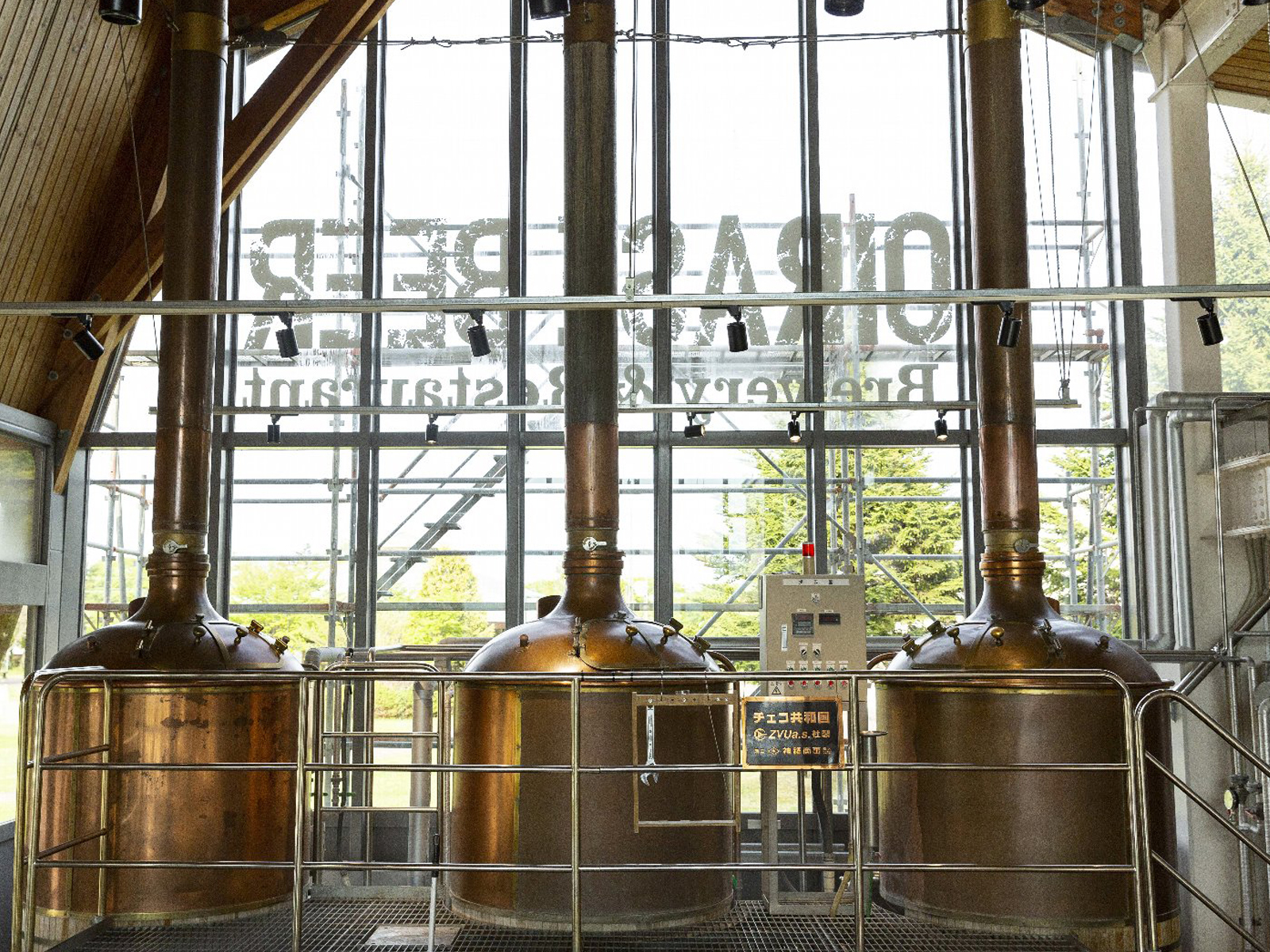 まず、奥入瀬ブルワリーアンドレストラン。2022年にオープンしたばっかりなんですけど、ブルワリーとレストランが併設されていて、レストラン入ってすぐ左側に3つの仕込み釜がある、すごくインパクトの強い建物になってます。平屋で天井が高くてすごく開放的です。一部がロフトのように2階に上がれる構造になっていて、遊具やハンモックを置き、ゆったりとくつろいでもらえるスペースになっています。お子様がいるご家族にすごく喜んでいただいています。