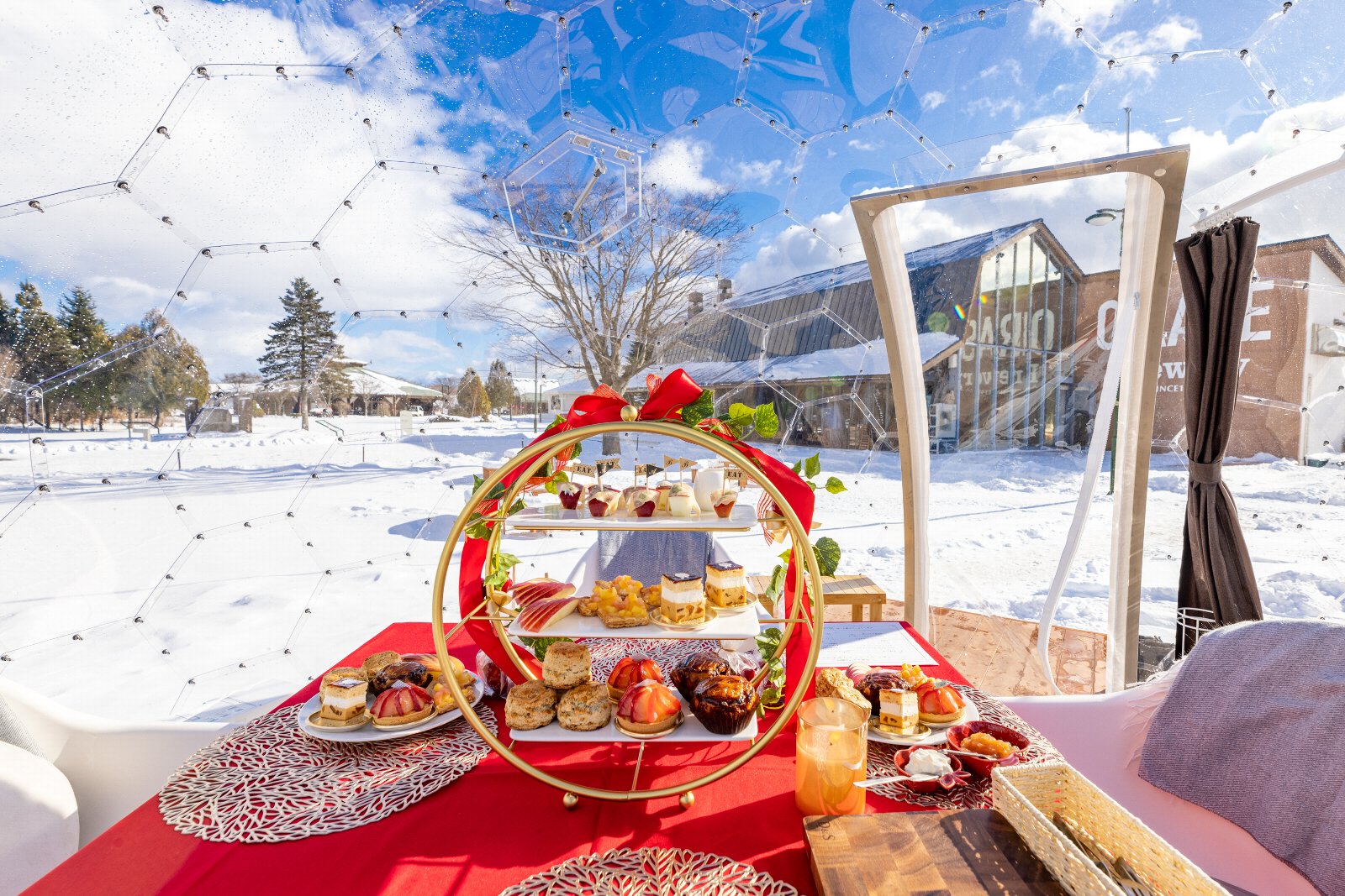 かまくらドームの中では、しゃぶしゃぶのコースを楽しむことができます。最後の締めはラーメンっていう感じのコースになっています。アフタヌーンタイム(14:30~16:30)には「あら、りんご。」が、リンゴだらけの限定スイーツを出しています。