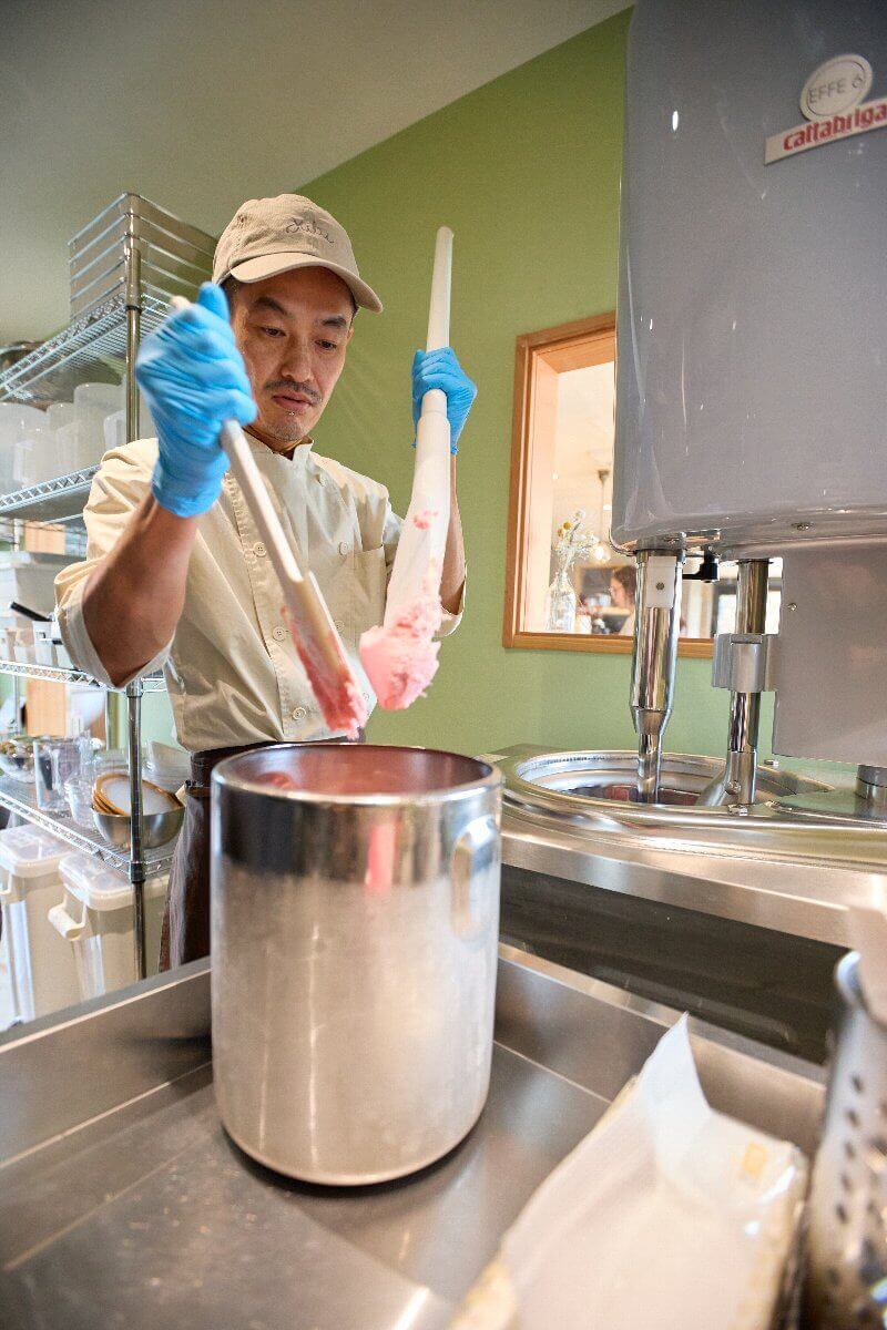 あと僕らの役割分担で言うと、ジェラートの作り方ってシンプルで、冷却しながら、撹拌して混ぜながら固めていくっていうことになるんですけど、うちはクラシックな作り方をしているので、この工程がけっこうな力仕事なんですよ。だから僕がやっているのもあるんです。機械が回転して、1秒ごとにジェラートの様子が変わっていくのを見ると幸せで。そういう意味では、メイクの仕事をしているときと変わらないです。メイクでも刻々と状態が変化していく中で、ベストなタイミングを見極めるのが好きだったんです。東京でもここでも好きなことをやって、ずっとハッピーかもしれません(笑)。